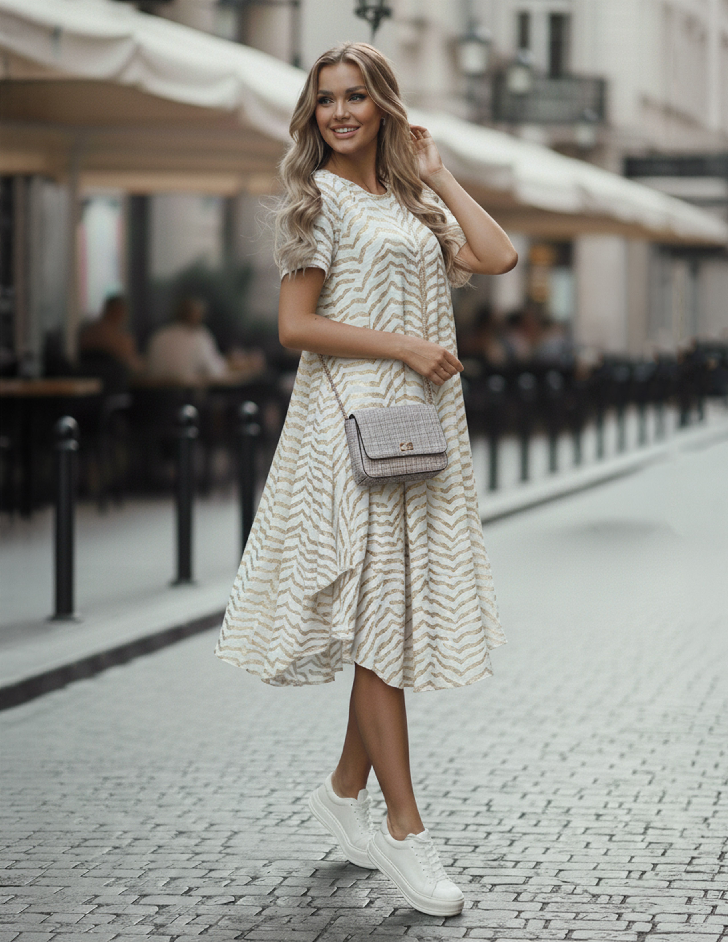 OPIS PRODUKTU: Elegancka sukienka trapezowa to sukienka na co dzień oraz na uroczyste okazje. Forma sukienki trapezowa. Rękaw krótki, dekolt klasyczny okrągły. Sukienka wykonana jest z taniny typu len w modne wzory. Ta modna sukienka sprawdzi się idealnie w połączeniu z elegancką torebką, klasycznym obuwiem, czy letnimi sandałami. Sukienka wykonana jest w Polsce ze szczególną starannością. Rozmiary od 38 do 48. Skład: 95% poliester, 5% elastan. Produkt wykonany jest w Polsce i spełnia wymagania Rozporządzenia (UE) 2023/988 (GSPR). Modelka ma 175 cm wzrostu i prezentuje rozmiar 40.